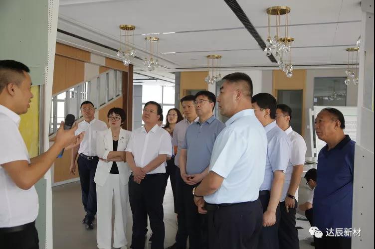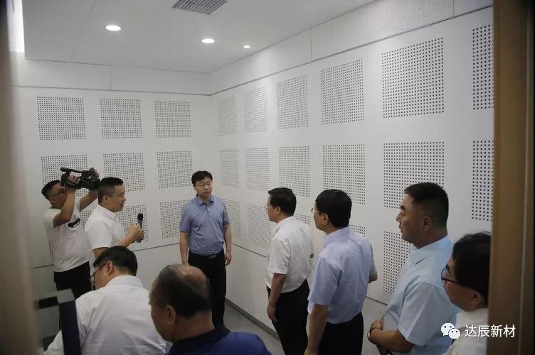 達辰展廳作為領(lǐng)導一行參觀的第一站,達辰新材總經(jīng)理王曉親自擔任講解,領(lǐng)導們了解了達辰各式建材產(chǎn)品與發(fā)展前景。當今隨著全面建成小康社會以來,在新時代新發(fā)展下人民經(jīng)濟生活水平不斷提高,人們在家居裝飾的需求已不在單一局限于家居外觀裝飾,而是更加青睞于具備功能性、便捷性、環(huán)保性的綠色建材產(chǎn)品。為順應時代新發(fā)展趨勢,達辰新材公司以可持續(xù)發(fā)展與創(chuàng)新作為戰(zhàn)略方向,研發(fā)出了達辰品牌紙面石膏板、礦棉吸聲板、輕鋼龍骨等系列產(chǎn)品。“這面是達辰紙面石膏板系統(tǒng)墻,上面覆有三種顏色,象牙色為標準板,紅色為耐火板,適用于防火需求較高的場所。綠色為耐水板,適用于相對濕度較大的空間。紙面石膏板可在裝飾中起到輕質(zhì)、隔聲、隔熱的作用,且施工簡便。根據(jù)石膏板功能的不同,可以運用于不同需求的場所,互相搭配使用?!痹谕蹩偨?jīng)理細致的講解下,領(lǐng)導們跟隨移步,認真聆聽?!斑@是礦棉吸聲板隔墻,礦棉吸聲板廣泛適用于辦公、教育、文化娛樂、運動、酒店等各種場所,具有綠色環(huán)保、吸聲降噪、保溫節(jié)能、輕質(zhì)易裝等優(yōu)能?!彪S后在達辰測驗墻面承重展示與聲學體驗室,領(lǐng)導一行在身臨其境中對達辰產(chǎn)品承重力與防聲優(yōu)能給予了贊賞。